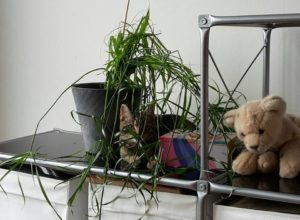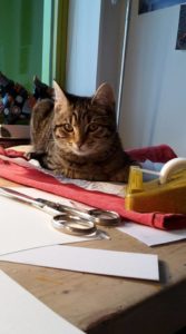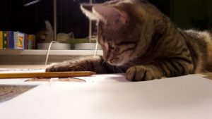 Gister hebben we heel fijn samen geknutseld. Zij deed iets met draadjes en ik kwam er niet eens aan. Heel soms kan ik dat. Vooral als ik slaperig ben. Onder haar knutseltafel staat een krukje, tegen de verwarming aan, en daar slaapt het zo heerlijk … Maar gisteravond kon ik het niet. Ze ging tekenen en ik móest met het potlood. Dat heb ik soms ook als ze aan het lezen is, dan móet ik opeens met de tablet.