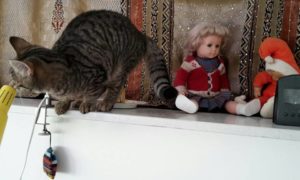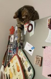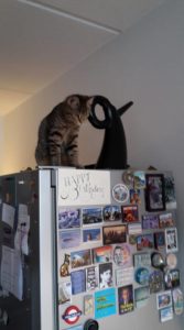 Maar ik ben dus op de koelkast geweest! Dat is vreselijk leuk, want alle magneetjes waar ik van beneden af net niet bij kan, kan ik er nu van bovenaf af gooien. Sommige zijn heel leuk om mee te spelen. En vanmorgen ben ik op de hoge vensterbank op de slaapkamer geweest. De springveren in mijn voetjes worden steeds sterker, ik sprong er zomaar vanaf het bed bovenop, de vrouw schrok ervan dat ik zomaar boven haar hoofd was!