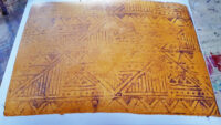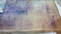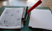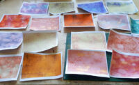 Het formaat waar ik nu op uitgekomen ben (ca. 8x12 cm) heeft voornamelijk praktische oorzaken. Ten eerste het formaat van de kleine gelli plate, 5x7 inch, dat is 12,7 x 17,78 cm. Omdat de randjes soms slordig uitpakken, kan ik uit het midden mooi de bladzijden snijden. Puur qua energie en moeite (schoonmaken!) werkt de kleine veel prettiger dan de grote, helemaal nu de image resist steeds beter begint te lukken.