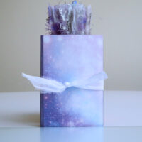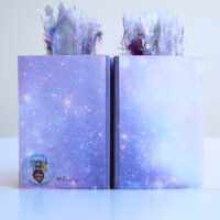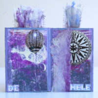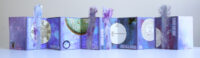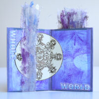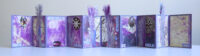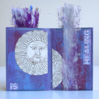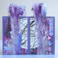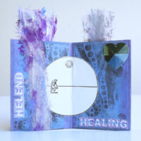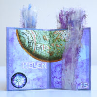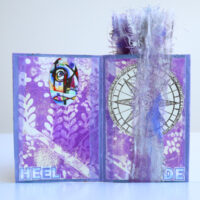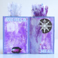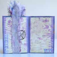 Een stapeltje paarsachtige gelli prints vroeg ook nog om verwerking. Ik had eigenlijk geen idee, maar toen kwam op de Dutch Collage Group de challenge Heal the World. Meteen schoot mij dat boek over nautische instrumenten te binnen, vol mooie ronde plaatjes van kompassen en ander wereldomvattend gereedschap. Tegelijk had ik ook weer eens zin in kliederen met verf op stof. Reepjes vitrage, zilver en paars en blauw, hopla. Teksten erbij in passende kleuren, nog wat edelsteentjes hier en daar … het is denk ik niet mijn mooiste boekje maar ik heb weer heerlijk geknutseld, onder het genot van de podcast The Librarian is In, waar bibliothecarissen van de New York Public Library gezellig over boeken kletsen.