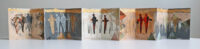 Ik weet niet meer hoe ik op het idee kwam om rechtstreeks op het harmonicaboekje te gelliprinten (in plaats van losse prints erop te plakken). Op de een of andere manier was ik in de stemming voor natureltinten, grijs, zand, beige, en een beetje goud. En voor het zelfgemaakte stempel van een rijtje mensfiguren. Vervolgens reepjes papier scheuren uit een oud boek, en die ook goud verven.