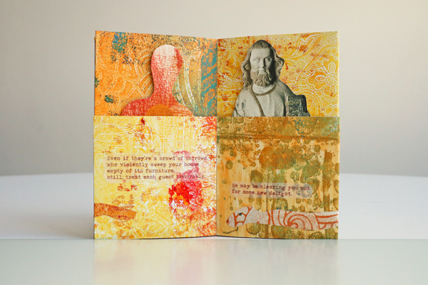 Dankjewel! Het gaat elke keer anders met de volgorde. Ik maakte eerst het boekje, met gelli prints die ik had gemaakt omdat iemand 3 boekjes wilde bestellen, maar dat intussen nog niet heeft uitgewerkt. Nadenkend over de vulling van de vakjes kwam ik op dat idee van die poppetjes. Toen kwam er een opdracht voor een verjaardagsboekje, van iemand die vroeg om citaten van Rumi. Terwijl ik die opzocht, kwam ik Guesthouse ook weer tegen, en dat paste opeens schitterend bij dit boekje! Dus zo is het gekomen.
