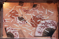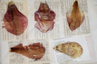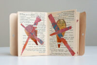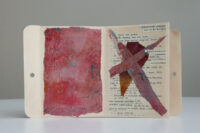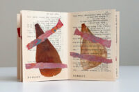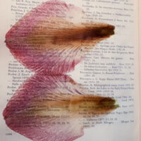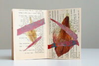 Het was een groot experiment, dat in feite niet al te best slaagde. Ik plakte de blaadjes op een ondergrond van boekbladzijden en liet ze drogen en pletten. Sommige overleefden dat al niet. De gelukte die niet gescheurd waren of loslieten voorzag ik van een dun laagje beschermend vernis. Bij sommige liet daardoor de lijm weer los, bij andere brak het blaadje alsnog in stukjes … maar ik wilde geen plakplastic of andere beschermlaag (ik houd ook niet van vernis op mijn collages, ik wil de textuur zicht- en voelbaar houden, dan maar geen eeuwigheid). Ik besloot ze met gescheurde strookjes bedrukt deli paper op hun plek te houden. Werd best mooi eigenlijk!