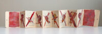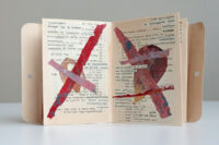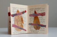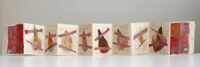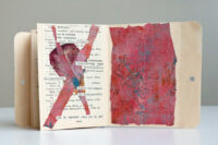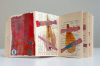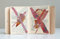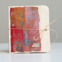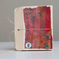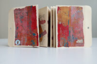 Na het plakken leg ik de boekjes onder de pletter, met lapjes stof ertussen omdat anders de lagen acrylverf aan elkaar plakken. Soms zie je dan duidelijk de afdruk van de stof, dat vind ik wel een mooi effect! (zie 2 na laatste afbeelding)
