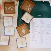 Nu nog woorden … ik wist niet precies wat of hoe maar begon te bladeren in een oud Grieks woordenboek. Woorden sprongen in mijn oog, ik knipte ze uit tot ik er zo'n stuk of 100 had, verdeelde ze in acht groepen en plakte ze op de bladzijden. Het werden bijna gedichten.