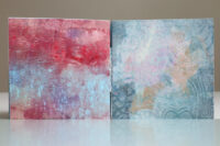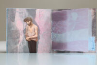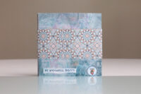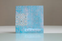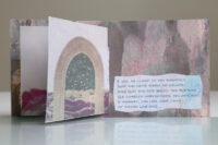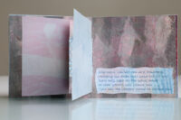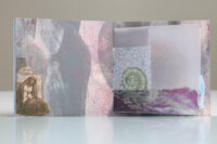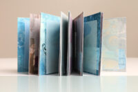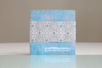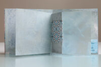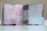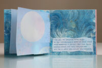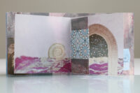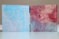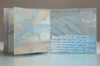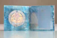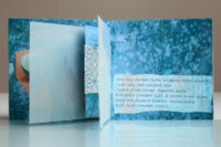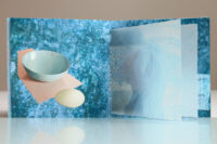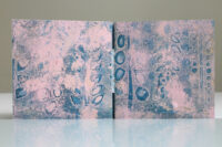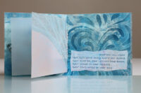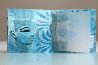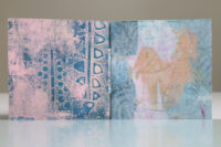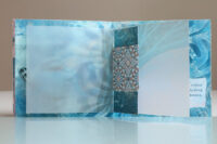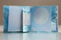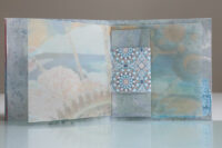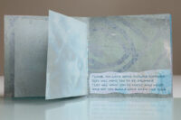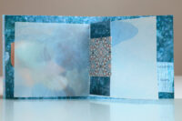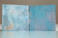 Zo ook dit bleekblauwe Australische scharnierboekje van gelli prints, met die scharnier van wondermooi papier, besteld bij Papier Royaal. (Af en toe moet het kunstenaarskind getracteerd.)