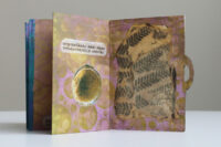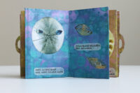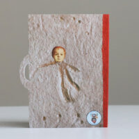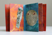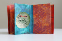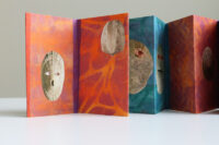 Na de mislukkingen van de naaiboekjes besloot ik om even lekker terug te grijpen op een basismodel: het harmonicaboekje. Heerlijk om te maken! Ik begon met het opplakken van de gelliprints op patroonpapier. Wat zou ik er eens van maken, waar moest het over gaan? Toen herinnerde ik me dat ik pas een prachtig fossielenboek had gescoord op Boekwinkeltjes. Ik koos de afbeeldingen op kleur, maar opeens zag ik overal gezichtjes in. Pareidolia!