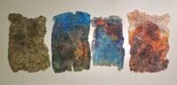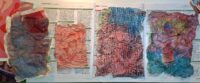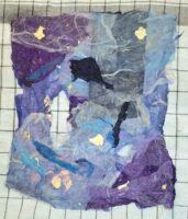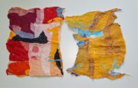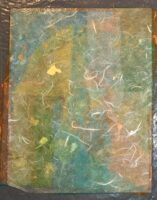 Momigami is dat je gekleurd papier zodanig verkreukelt (al dan niet met olie) dat het een totaal andere structuur krijg, het voelt bijna als stof. Joomchi is dat je – een beetje zoals met wol vilten (denk ik) – verschillende lagen moerbeipapier met elkaar verweeft met behulp van veel water, vouwen, rollen, proppen en peuteren.