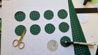 De eerste poging met de nieuwe cirkelsnijder leek hoopvol, maar algauw bleek dat de prikker erg makkelijk uit zijn gaatje schoot waardoor ik heel slordige cirkels kreeg. Dan maar met de hand uitsnijden, besloot ik vrouwmoedig. Om vervolgens totaal geen zin meer te hebben in het project: 48 keurige cirkels uitsnijden! Bestond er een wet waarin stond dat dat moest? De joomchi vellen waren zelf toch ook helemaal niet netjes?