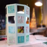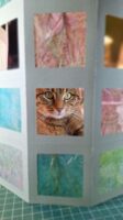 Ik sneed vierkantjes uit, om daar vervolgens de joomchi's overheen te plakken, of tenminste, dat was het plan. Maar de andere joomchi's pasten qua kleur eigenlijk helemaal niet bij het groen-turquoise schema … en wacht, waren gelliprints eigenlijk ook niet mooi doorzichtig?